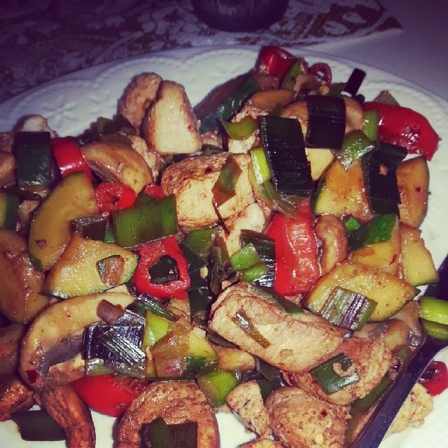 Skjær opp i biter og stek det i en teflonpanne,siden man skal bruke så lite olje jeg hadde også i cayennepepper og chiliflak.