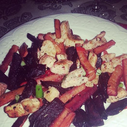 Skjæres i staver, ha litt olje i en bolle og krydder etter smak, vend grønnsakene i dette – jeg brukte Italian Seasoning, fra iHerbs. Stekes i ovnen på bakepapir, 200 grader i 20 min.