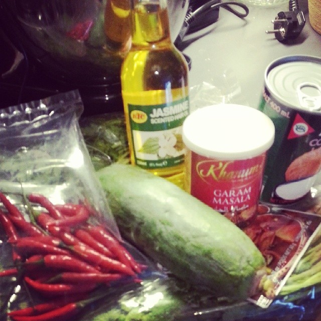 Alt dette for litt over 100 lappen. 2 pk koriander, papaya, mini chili, Garam Masala krydder, kokosmelk, red curr paste og Jasmin olje til håret.