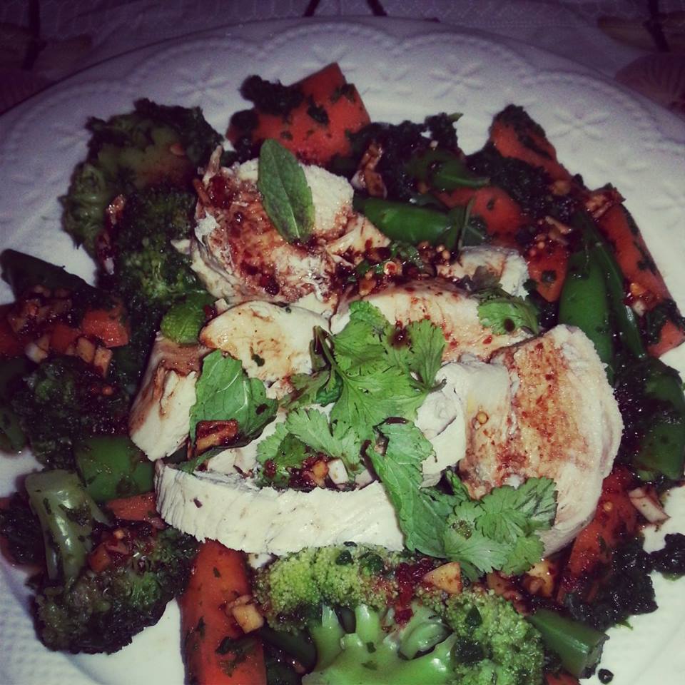 Server kyllingen på en seng av grønnsakene, og drypp over dressingen. Pynt med frisk koriander og mynteblader.