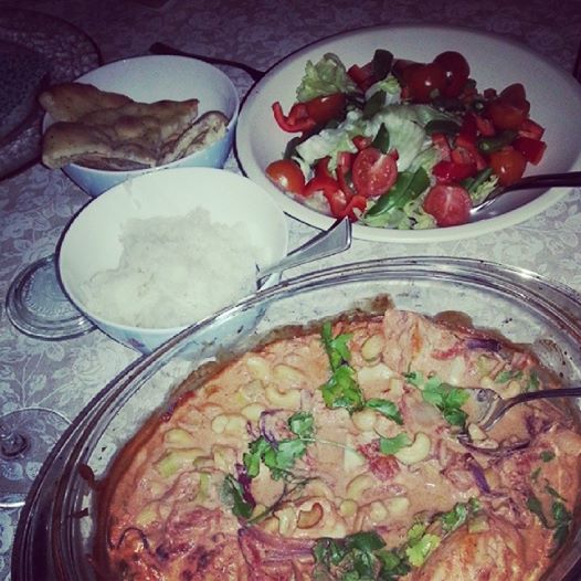 Ris, salat og naan-brød med koriander smaker godt ved siden av!