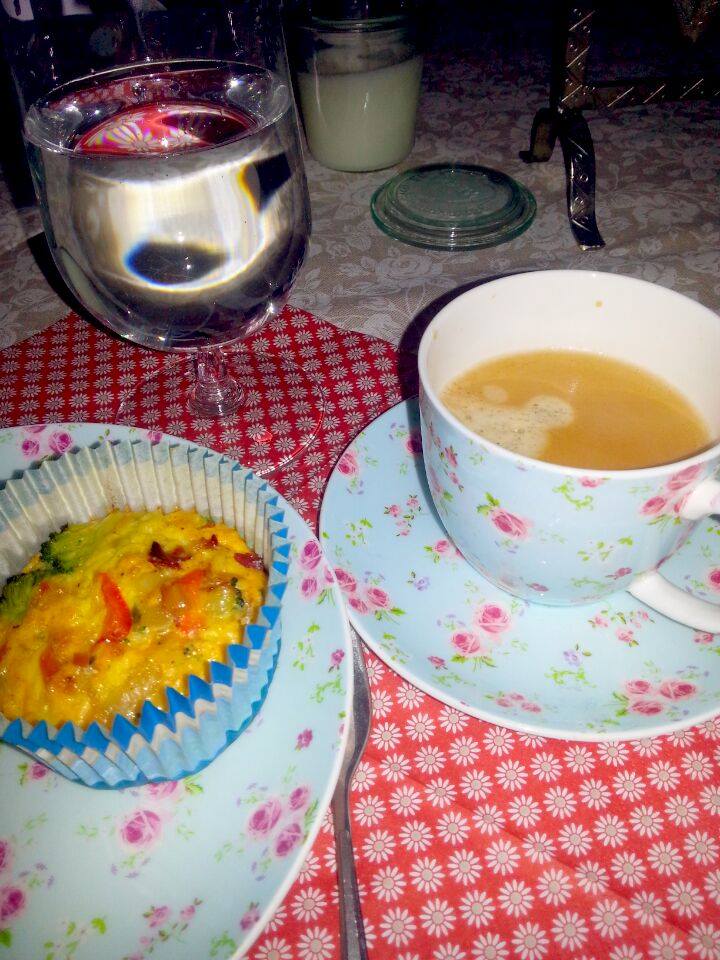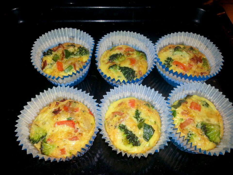 Ha oppi resten av grønnsakene i pannen og varm de litt, når du er ferdig tar du stekepannen til side og fyller opp ca 6 store muffinsformer. Hell over eggeblandingen og stek eggmuffinsene midt i ovnen i ca 20 minutter.