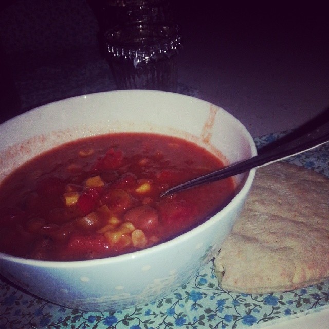 Server suppa med resten av bønnene, mais og pitabrød til:))