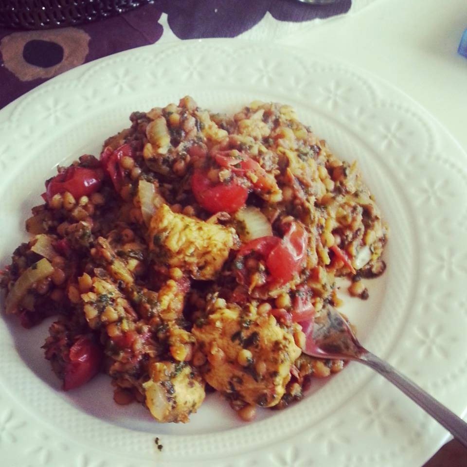 Skjær kyllingen og løken i passende biter, finhakk hvitløk. Stekes i pannen med olje og krydderblandingen til det blir gyllent. Tilsett spinat, linser og tomater og la det koke i 5 min.