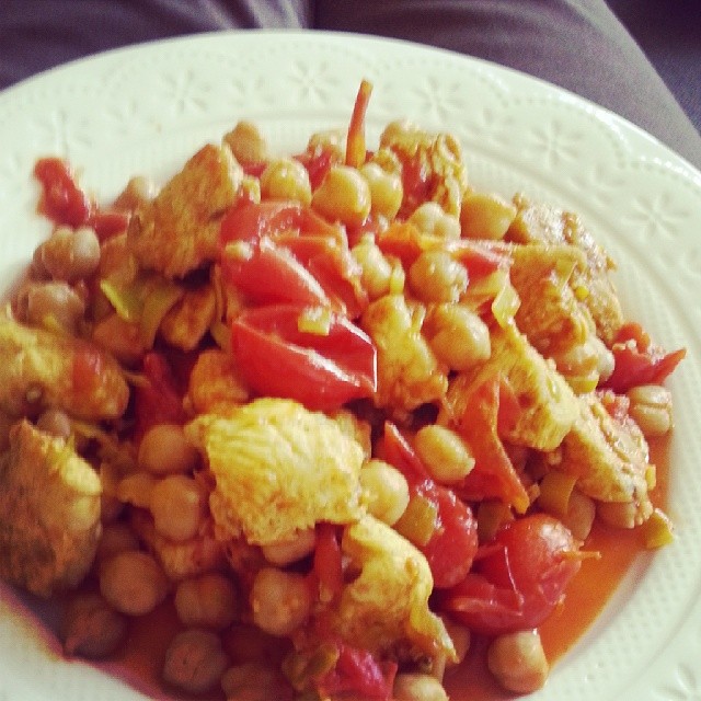 Del kyllingen i terninger og stek forsiktig, litt om gangen i 5-6 minutter (skal ikke bli brunt). Ta kyllingen over i et fat og la den stå på benken. Tøm pannen for eventuell væske. Ta olje i pannen og surr løk og chili til det er blitt mykt, men ikke brunt. Ta løk og chili oer på fatet som kyllingen er på. Bland alt krydderet i en liten bolle (spiskummen, koriander, safran, chilipulver, garam masala). Ta olje i pannen og surr krydderet 1 minutt, tilsett tomatboksen og kok opp, tilsett tomatpuré og sennep. La dette surre i ca 15 minutter, tilsett limesaft og sukker og la det surre videre i ca 5 minutter, tilsett kylling og løk og la det surre i ca 5 minutter. Tilsett bønnene, skru ned varmen og det trekke ca 10 minutter. Tilsett koriander og smak til med salt og pepper.