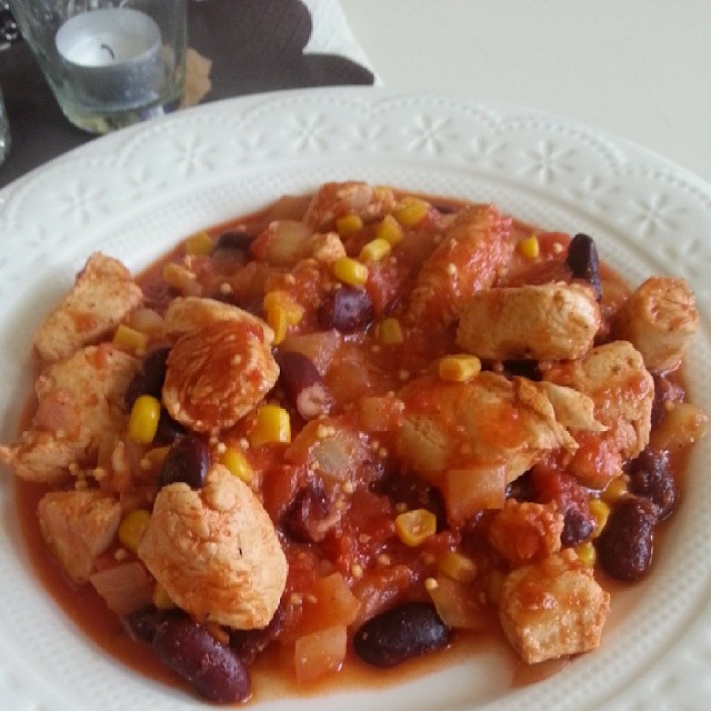Skjær kyllingen og løken i passe biter, brunes tilsett krydder, tomater, mais, bønner og hirse, la det koke i ca 10 min.