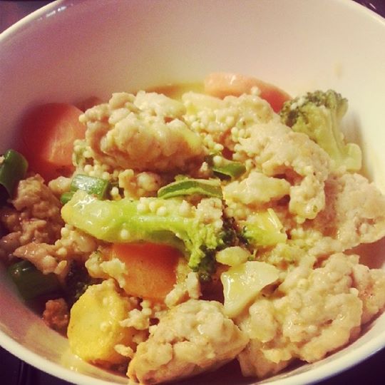 Brun kyllingkjøttdeigen, tilsett grønnsakene og kokosmelken og paste, la det koke i 5 min.
