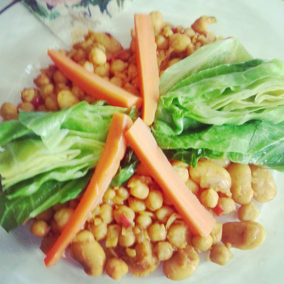skyll bønnene og kikkertene, Stek finhakket skrelt hvitløk, chilli og sjalottløj i litt olje, tilsett gurkemeie, spisskummen og currypaste. Tilsett bønner og kikerter og 1 dl vann og la det smååkoke i ca 10 min. Damp gulrøttene og spisskålen for seg selv al dente.