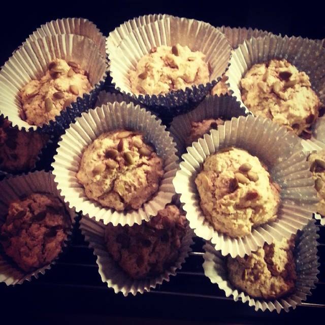 Sett ovnen på 175 grader. Bland først isammen det tørre. Smuldre inn smøret og tilsett melken. Fyll i muffinsformer, de hevet ikke så mye som jeg trodde, så jeg kunne hatt mer i hver. Dryss på gresskarkjernene. Stekes i15-20 min.