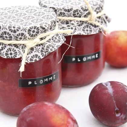 * Del plommene i to og ta ut steinene. Ha dem i en dyp langpanne,og rør dem sammen med sukker og krydder. Sett pannen midt i ovnen til plommene har blitt myke og saften er tykk. Rør nå og da under steking. Ta pannen ut og sett til side.
