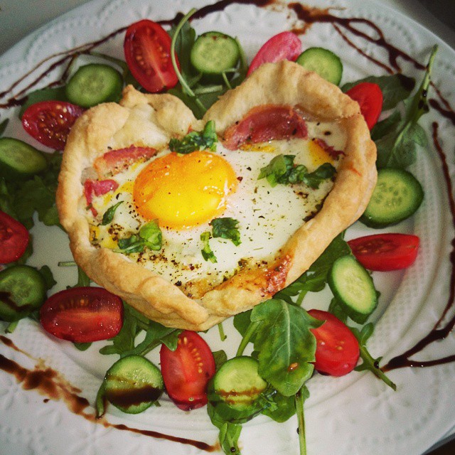 Butterdeig, bacon, egg, ruccola, tomat og agurk, det ble kjempegodt. Fant oppskriften på http://www.godt.no/#!/oppskrift/573/egg-og-bacon-hjerteterte