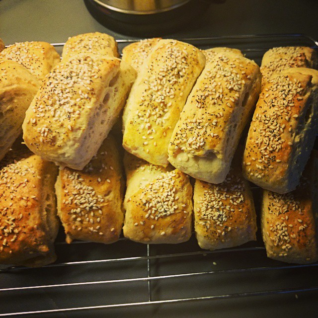 Sett ovnen på 210 grader, når de har hevet til dobbelt str pensler du dem med egg og strør på frøeme.