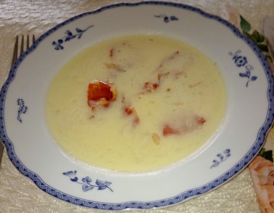 Smelt smør og fres løk og poteter i terninger. Slå på kraft og kok til potetene er møre. Ha i fløten og kjør suppen glatt med en stavmikser eller blender. Smak til med salt.