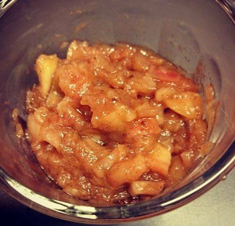 Del eplene i små biter, jeg tok to m/ skall og tre u/. Tok noen twist med vaniljestang, ellers kan man bruke en vaniljestang og skrape ut frøene. Kok opp eplebiter, vann, vaniljefrøene og honningen i 15-20 min, smak til med kanel på slutten.