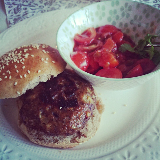 Hjemmelaget hamburgerbrød og karbonader m tomatsalsa