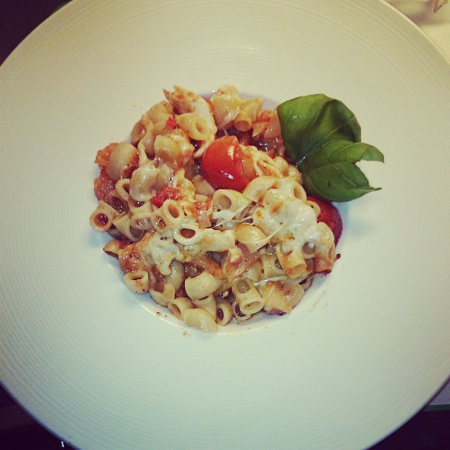 Hell den halvkokte makaronien i en ildfast form, hell over kyllinblandingen, legg på noen cherrytomater delt i to rør lett. Ha en pk skivet mozzarella på toppen (2 pax) og stek til det blir gyllent. Legg litt fersk basilikum på før servering.