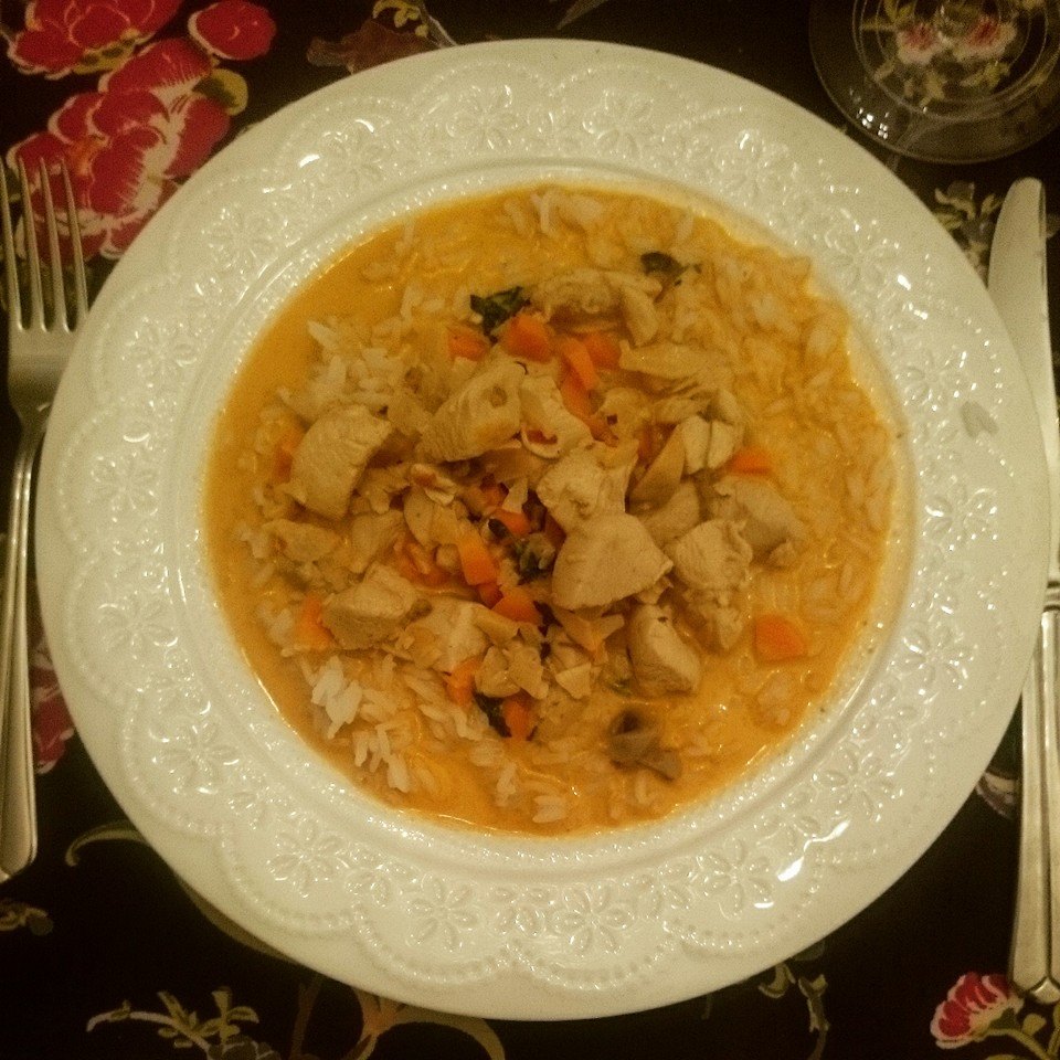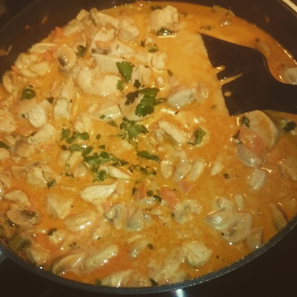 Stek løk, hvitløk og ingefær med litt olje og tilsett currypaste, paprika og tomatpure. Når løken er gylden tilsetter du gulrøttene og champignonen og 2 dl av vannet og lar det koke på svak varme. Stek kyllingbitene for seg selv i en panne til de får litt farge. Tilsett spisskummin, chillipasten, limeblader, limesaft og finrevet limeskall, kardemumme og korianderfrø i curryen samt kyllingen, gi det et oppkok og stå å putre litt på svak varme. Etter en stund tilsetter du kokosmelken og 4 dl vann la det koke over svak varme, rett før servering har du på finhakket fersk koriander og ristede kokosflak.