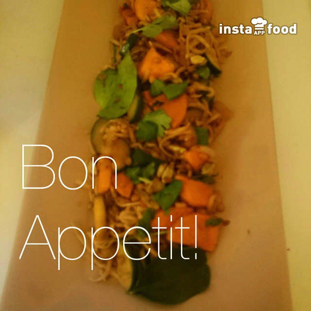 Jeg stekte grønnsakene og krydder i en wok panne med oljen, tilsatte soyasausen og lot det steke litt. Nudlene kokes etter anvisning på pakken, tilsettes i wokpannen før servering, pynt med frisk koriander.