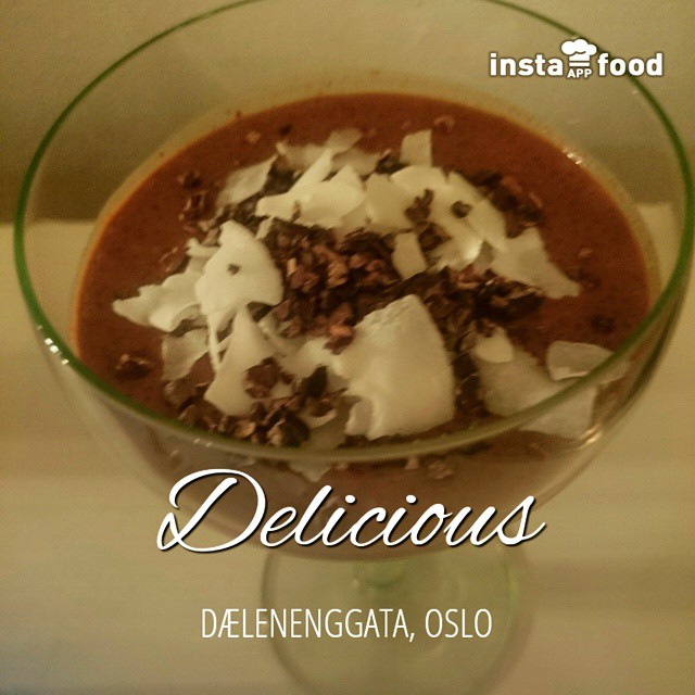 Bland sammen ingrediensene, rør rundt med en skje til det begynner å tykne, eller så kan du også blande det i en shaker. Hell massen i en skål og la den stå minst en time i kjøleskapet for å tykne. Topp den med kokosflak og kakaonibs.