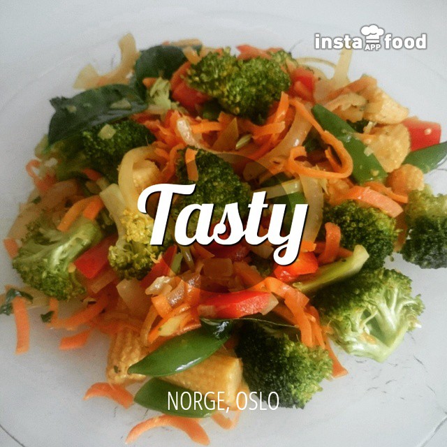 Varm oljen og smøret og surr løk og ingefær i ca 1-2 min, tilsett resten av grønnsakene og la det steke 3-4 min i wokpanne.