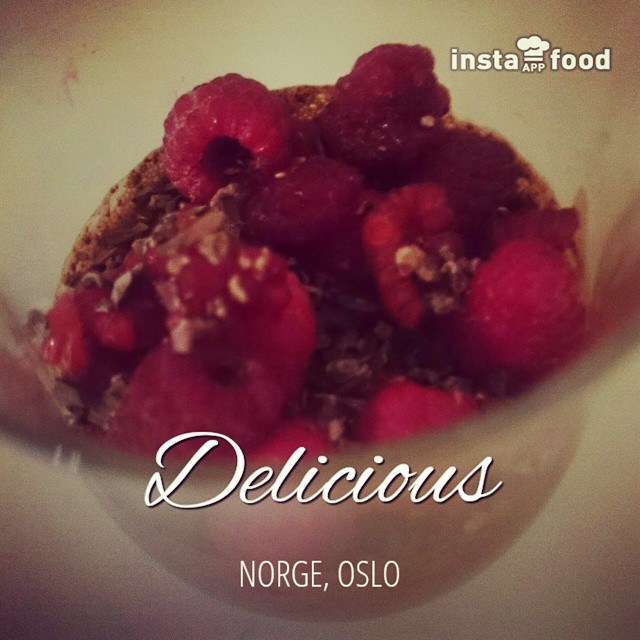 Bland sammen ingrediensene, rør rundt med en skje til det begynner å tykne, eller så kan du også blande det i en shaker. Hell massen i en skål og la den stå minst en time i kjøleskapet for å tykne. Topp den med bringebær.
