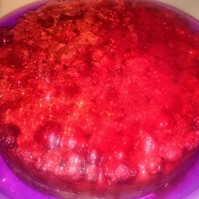 Jeg har fylt kaken med vaniljekrem, og brukte bringebær og bringebærgele på toppen som lokk – bilde av det ferdige resultatet kommer, den må bare få avkjølt seg litt.