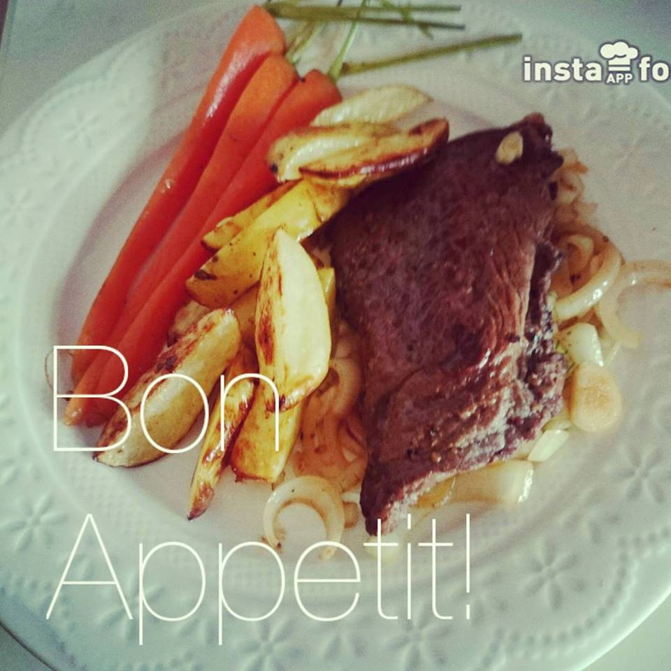 I dag lagde jeg marinert mørbradbiff på en seng av sjalottløk, gulrot og pommes frites, ble kjempegodt. Stekte potetene i ovnen sprinklet litt olje og hadde på grovsalt over.