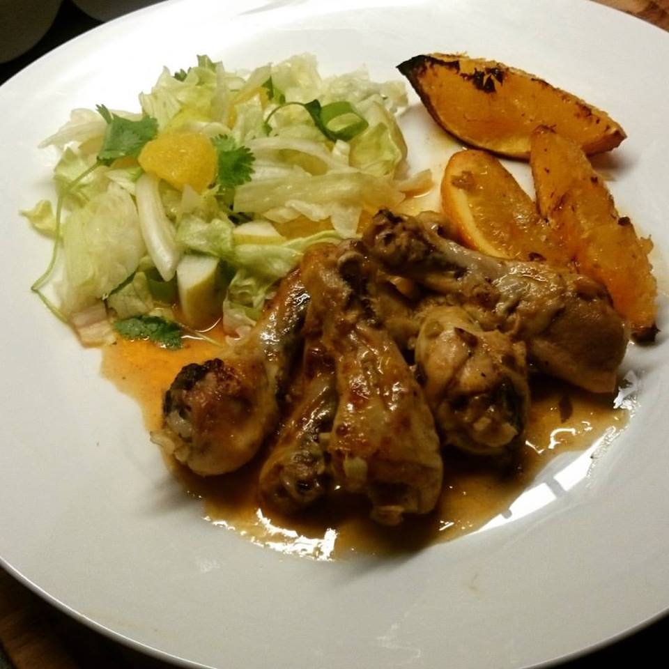 Brukte Tinas naturelle kyllinklubber fra Kiwi, blandet sitron, olje, salt & pepper, fersk basilikum og chipotle til marinaden og la noen båter appelsin i formen sammen med klubbene stekte på 200 C og økte til 225 C på slutten, snudde klubbene underveis. Saftig deilig kylling 🙂