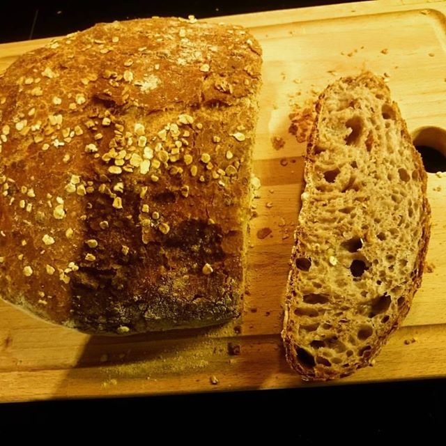 Når brødet var ferdig etterhevet penslet jeg det med litt olje og strødde på litt havregryn.