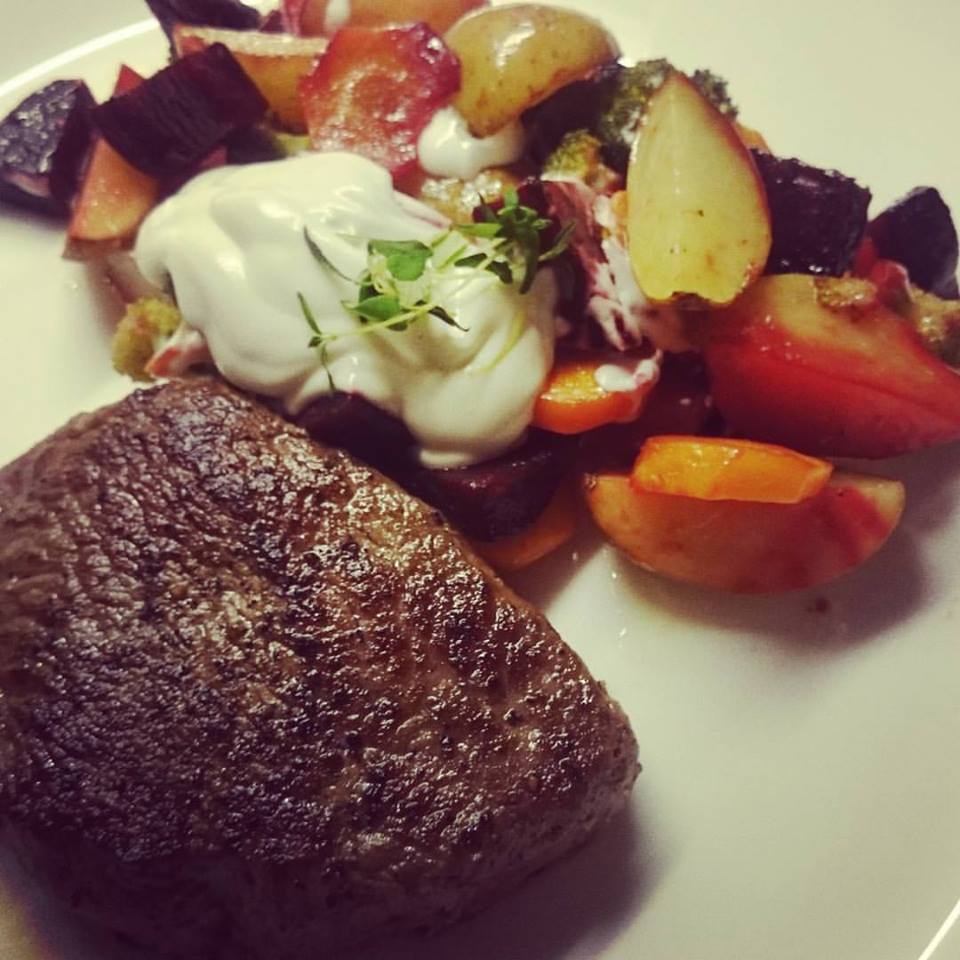 Til middag lagde jeg deilig biff med rotgrønnsaker og chevrekrem