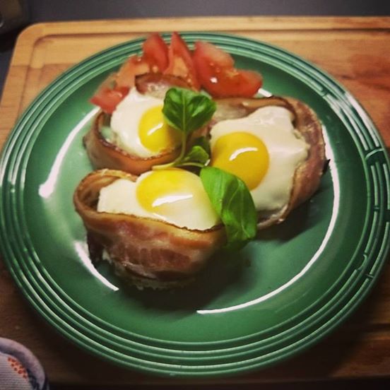 Legg baconskivene rundt langs kanten i formene. Knekk et egg i hver av formene.