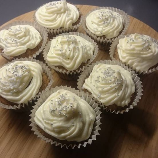 Sett papirformer i muffinsbrett og fyll deigen i formene så de blir ca 2/3 fulle. Stekes midt i ovnen ved 180°C i 10-15 min (sjekk med kakenål at de er gjennomstekte). Pass på ved slutten av steketiden, da steketiden kan variere fra ovn til ovn. Stikk en kakepinne i for å være sikker på atde er ferdige, om de ikke er noen røre på pinnen er de ferdige. Mens cupcakene kjølner på en rist lager du glasuren.