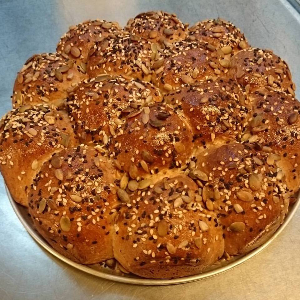 Ha deigen på bordet og elt den litt. Del deigen i 15 emner og trill boller. Sett bollene i den runde formen (eller den lille langpannen) smør formen med formfett eller bruk bakepapir. Dekk til og etterhev på et lunt sted i 30 min.