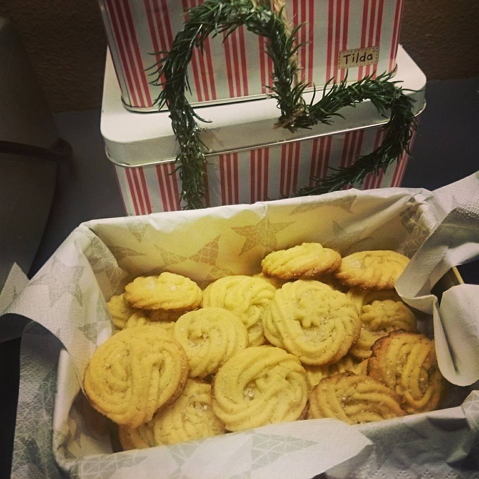 Hadde igjen masse eggeplommer etter at jeg lagde kokosmakroner i går, så da googlet jeg og fant denne oppskriften på http://www.jaktenpaenhobby.wordpress.com Kjeksene ble kjempegode, men ikke så lett å få ut av sprøyteposen. Disse kjeksene minner om shortbread cookies, en type smørkjeks opprinnelig fra Skottland.