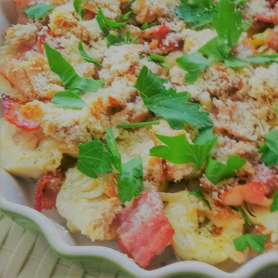 Artisjokk hjerter og bacon, gratinert m/ brødsmuler og parmesan ost