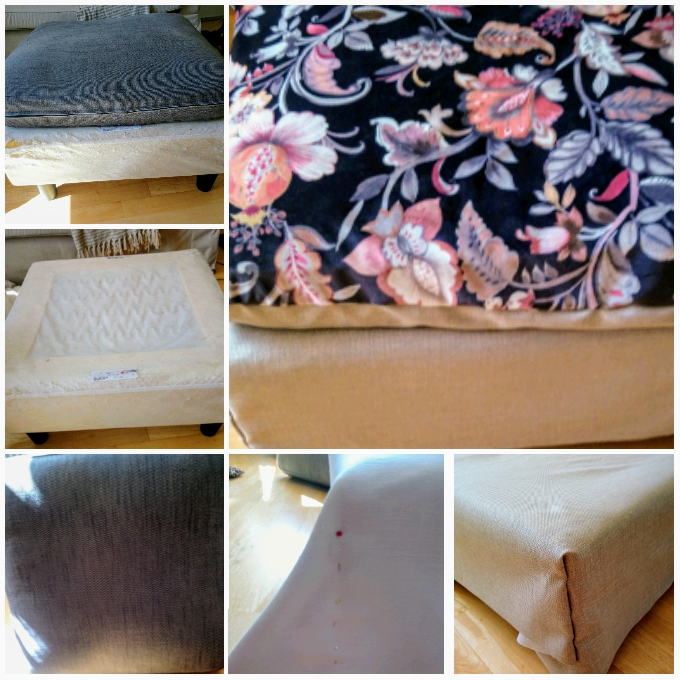 Jeg har byttet sofa fra Ektorp med sjeselong til 3 seter Ektorp. I den anledning tok jeg vare på sjeselong delen av sofaen, tok bort stativet den var festet med og satte på to av bena fra gamlesofaen + en setepute fra sofaen. Puffen blir da 70 x 70 cm. Har kjøpt et møbelstoff som er nesten helt likt sofaen og et i mønstret velour.