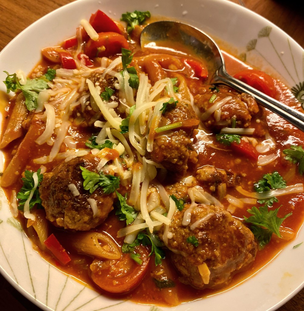 Tilsett kjøttbollene, cherrytomatene og la det koke videre i ca 10 min til pastaen er ferdig rør om av og til.