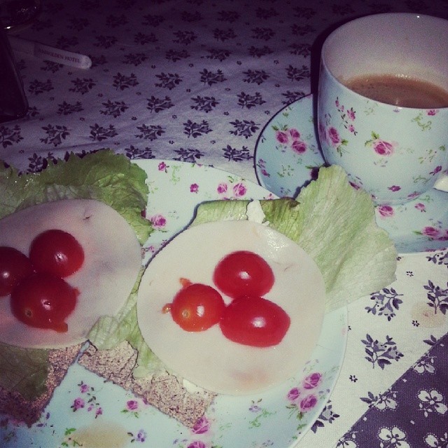 Var litt rart å spise vanlig mat til frokost hadde jeg: 2 bygg knekkebrød m salat, naturell smøreost, 2 skiver kalkunpålegg og tomat og en kaffe:) Ellers har jeg spist 1 Skyr m rips og en kirsebær smoothie. Til middag ble det Nydelig Kreolsk Kyllinggryte fra kokeboken «Helt Naturlig Mat» av René Zografos. Det ble også to glass vin,1 eple, 1 appelsin og 1 knekkebrød til m smøreost, kalkun, salat og tomat i løpet av dagen.