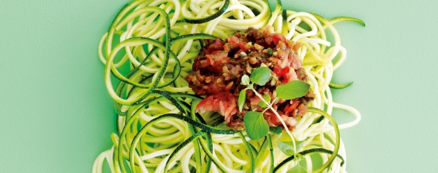 Ha alle ingrediensene til tomatsausen i en kjøkkenmaskin, og kjør til du har en jevn masse. Kjør squash i en spirali, og bruk de minste hullene, slik at den får samme form som spagetti. Fordel ”pastaen” i to skåler, og hell tomatsausen over.