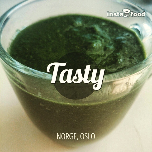 Smoothie med 50 g grønnkål (18 kcal), 100 g mango (65 kcal) og vann + litt kanel og 2 ts purely greens