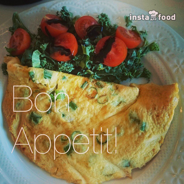 Omelett med vårløk lagd av to egg med grønnkål og cherrytomater til