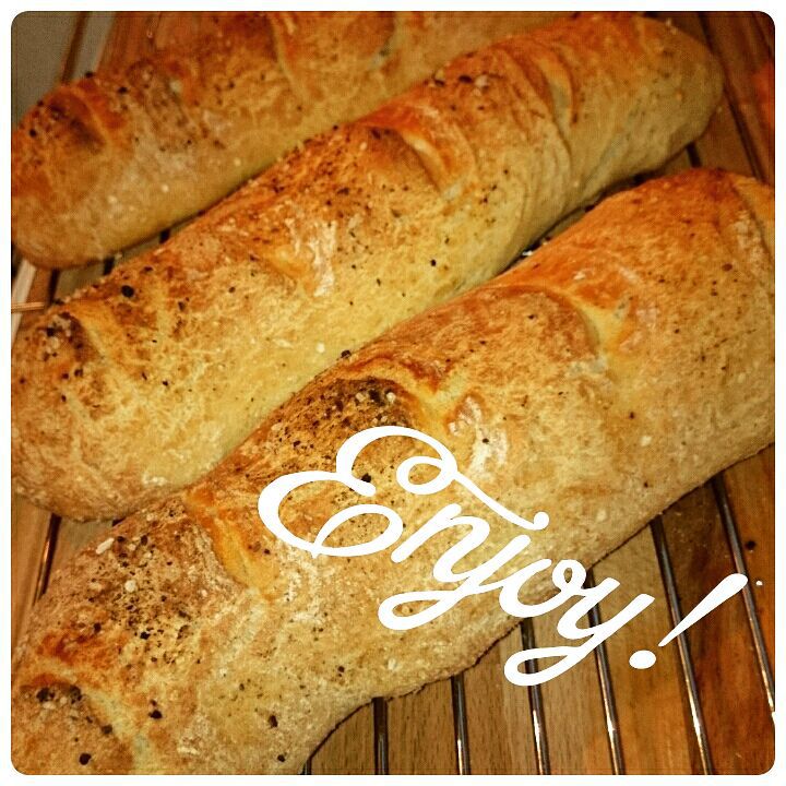 Brukte samme oppskrift som over, men brukte hvetemel ved utbaking ikke Fibra mel, finhakket rosmarin som jeg hadde inni deigen. Når deigen hadde hevet i 8 t, eltet jeg den sammen brettet litt frem og tilbake, la deigen i bollen igjen hadde litt olivenolje over toppen og lot den heve i ytterligere 2 t. De ble så gode 🙂