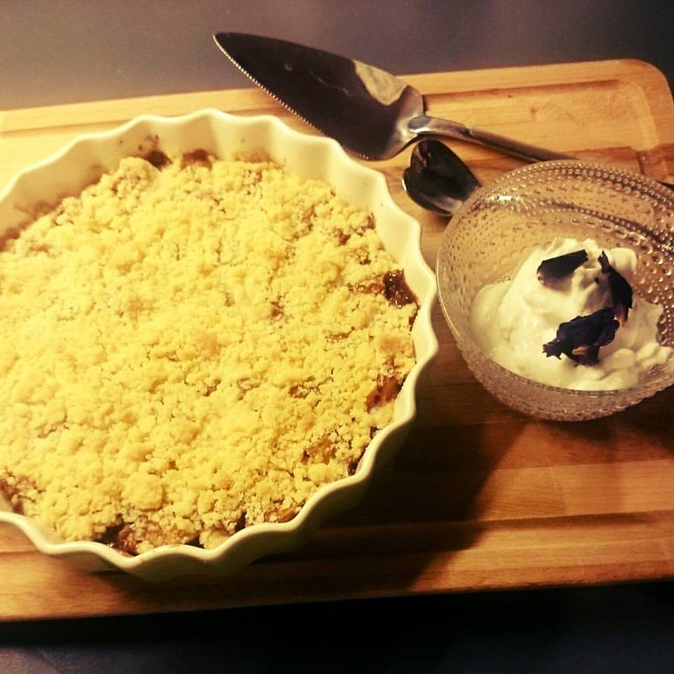 Skrell eplene, og skjær dem i terninger – gi dem et oppkok med sukkerblandingen. Hell de over i paiformen. Ha crumbelen over eplene, stekes på 200 C i 25-30 min.