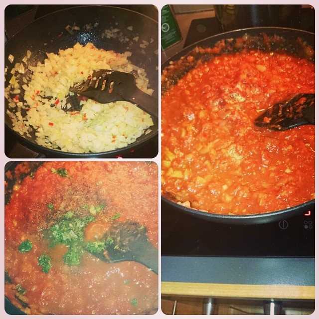 Surr løk, hvitløk og chili i litt olje. Tilsett tomater og pesto kok 10-15 min eller lenger. Smak til med salt, pepper og andre krydder etter ønske. Ha i litt sukker for å heve smaken.