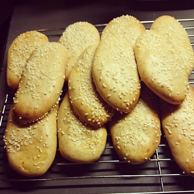 Pensle pølsebrødene med sammenpisket egg og dryss over sesamfrø.