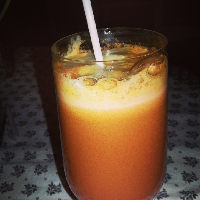 Skal ha med meg en smoothie-juice til lunsj bestående av 3 gulrøtter, 1 Granny Smith eple, 2 ferske rødbeter, 1 bit ingefær lages i juicer, 2 dl Biola m bringebær helles oppi juicen ristes i flaske – Voila.