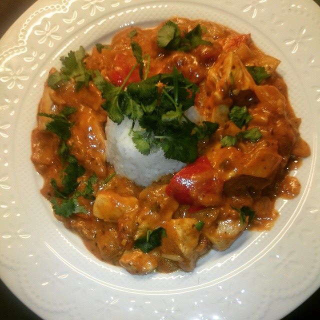 1 stor kyllingfilet, 1/2 gul løk, halv rød paprika, 1 fedd hvitløk, litt fersk ingefær og fersk koriander, 1 glass Uncle Bens tikka masala og 2 ss rømme. Serveres med ris til.