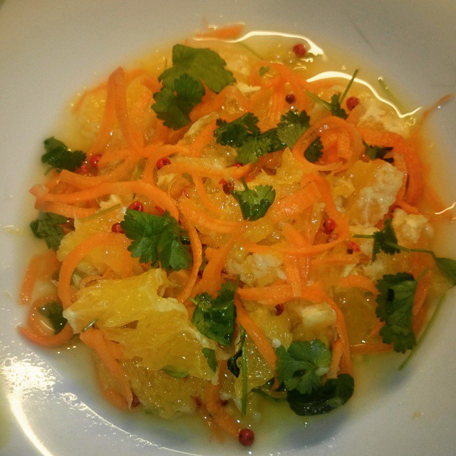 Gulrotråkost m appelsin, koriander, lime og rosepepper