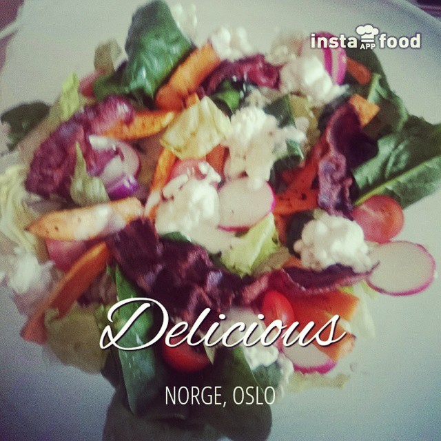 Skrell og skjær søtpoteten i strimler/staver og stek den på 200 C, varmluft, i 30 min. Jeg sprinklet litt olje over og brukte urtesaltet fra Olivers & co. Jeg stekte baconet i ovnen sammen med potetene, da blir det ekstra crispy.