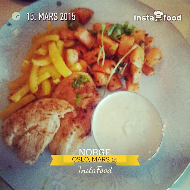 I dag lagde jeg kyllingfilet, råstekte søtpoteter, paprika og saus med mangochutney og kesam.